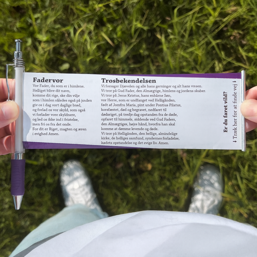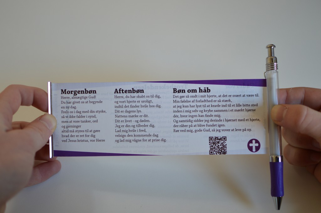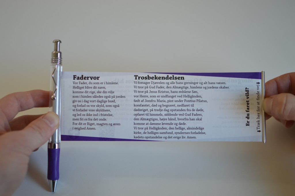På forsiden af fanen som kan trækkes ud står fadervor og trosbekendelsen. På bagsiden står en morgenbøn, en aftenbøn og en bøn om Guds nærvær når livet er svært. I tilknytning hertil er en QR kode som er et link til en musikvideo med Justin Bieber som synger “Pray”.